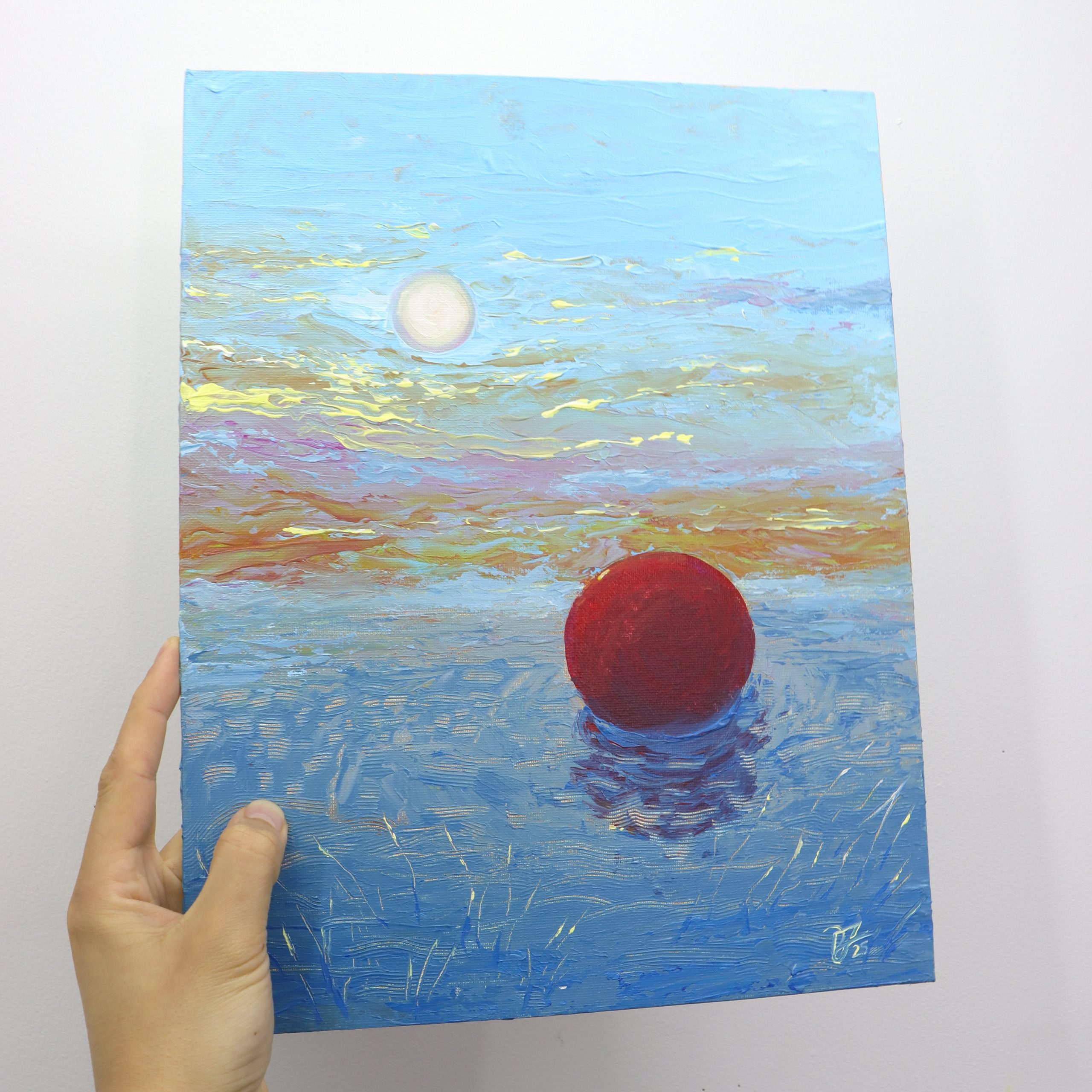 Expressionistic rendering of a red ball floating in a lake.